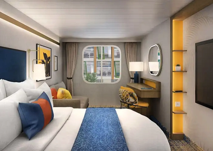 T5 - Vnútorná kajuta s oknom / Surfside Family 17 m². Neotvárateľné okno s výhľadom na štvrť Surfside. 8. paluba vpredu. Max 4 osoby. 3 144 € 1 048 € za osobu