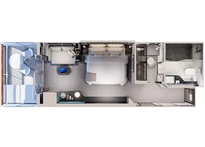 Ocean Suites - Ocean Terrace Suite OT4 Suita 28 m² + kúpeľňa 4 m² + terasa 7 m². 9/10. paluba stred. Spálňa s obývacou časťou, šatník. Minibar, kávovar, vodná kanvica, ďalekohľad, sejf, kúpeľňa so sprchou. Fľaša šampanského na privítanie. Maximálna kapacita 2 dospelé osoby + 1 dieťa do nedovŕšených 18 rokov. 9 200 € 4 600 € za osobu