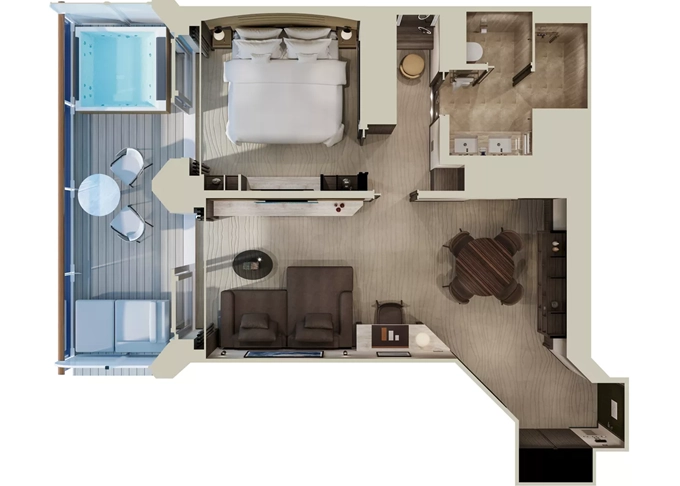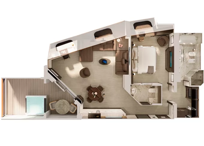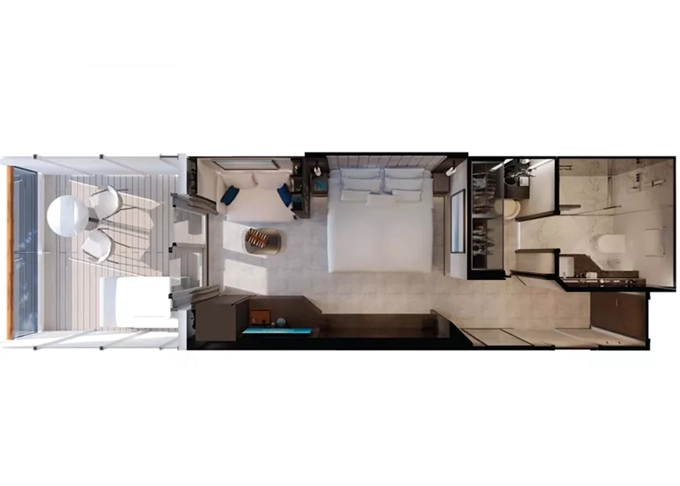 Ocean Residence - Cove Residence s vírivkou Suita + terasa s vírivkou a lehátkami 56 m². Spálňa s obývacou a jedálenskou časťou, šatník. Koktailová súprava, minibar, kávovar, vodná kanvica, ďalekohľad, sejf, kúpeľňa so sprchou. Závesy, svetlo, klimatizácia ovládané smart technológiou. Taška Technogym Case Kit. Fľaša šampanského na privítanie. Maximálna kapacita 3 osoby. 13 845 € 4 615 € za osobu
