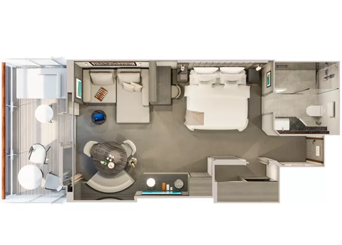 Ocean Residence - Cove Residence Suita + terasa so sedením a lehátkami 56 m². Spálňa s obývacou a jedálenskou časťou, šatník. Koktailová súprava, minibar, kávovar, vodná kanvica, ďalekohľad, sejf, kúpeľňa so sprchou. Závesy, svetlo, klimatizácia ovládané smart technológiou. Taška Technogym Case Kit. Fľaša šampanského na privítanie. Maximálna kapacita 3 osoby. 26 272 € 6 568 € za osobu