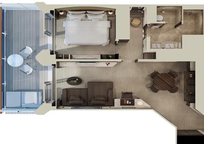 Ocean Suites - Ocean Terrace Suite OT1 Suita 28 m² + kúpeľňa 4 m² + terasa 7 m². 6. paluba stred / 7. paluba vpredu, vzadu. Spálňa s obývacou časťou, šatník. Minibar, kávovar, vodná kanvica, ďalekohľad, sejf, kúpeľňa so sprchou. Fľaša šampanského na privítanie. Maximálna kapacita 2 dospelé osoby + 1 dieťa do nedovŕšených 18 rokov. 5 930 € 5 930 € za osobu