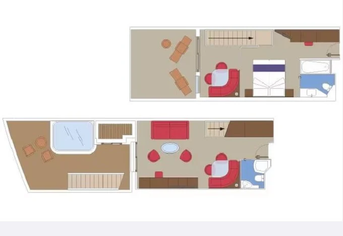 | YJD - Yacht Club Duplex Suite s vírivkou 46 m² + balkón 30 m². Vírivka. 2 podlažia, šatník, 2 kúpeľne (1 s vaňou). Max 4 osoby. 16. paluba. Cenový model MSC Yacht Club. | 9 612 € 3 204 € za osobu | ||